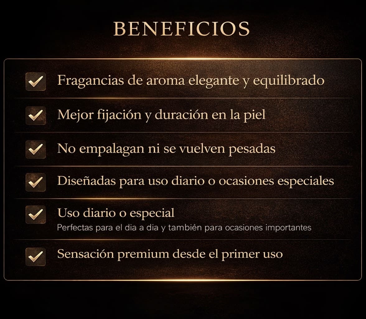 Nuestros perfumes están diseñados para ser elegantes y equilibrados, con una presencia agradable que no empalaga ni molesta. Funcionan bien tanto para uso diario como para ocasiones especiales.